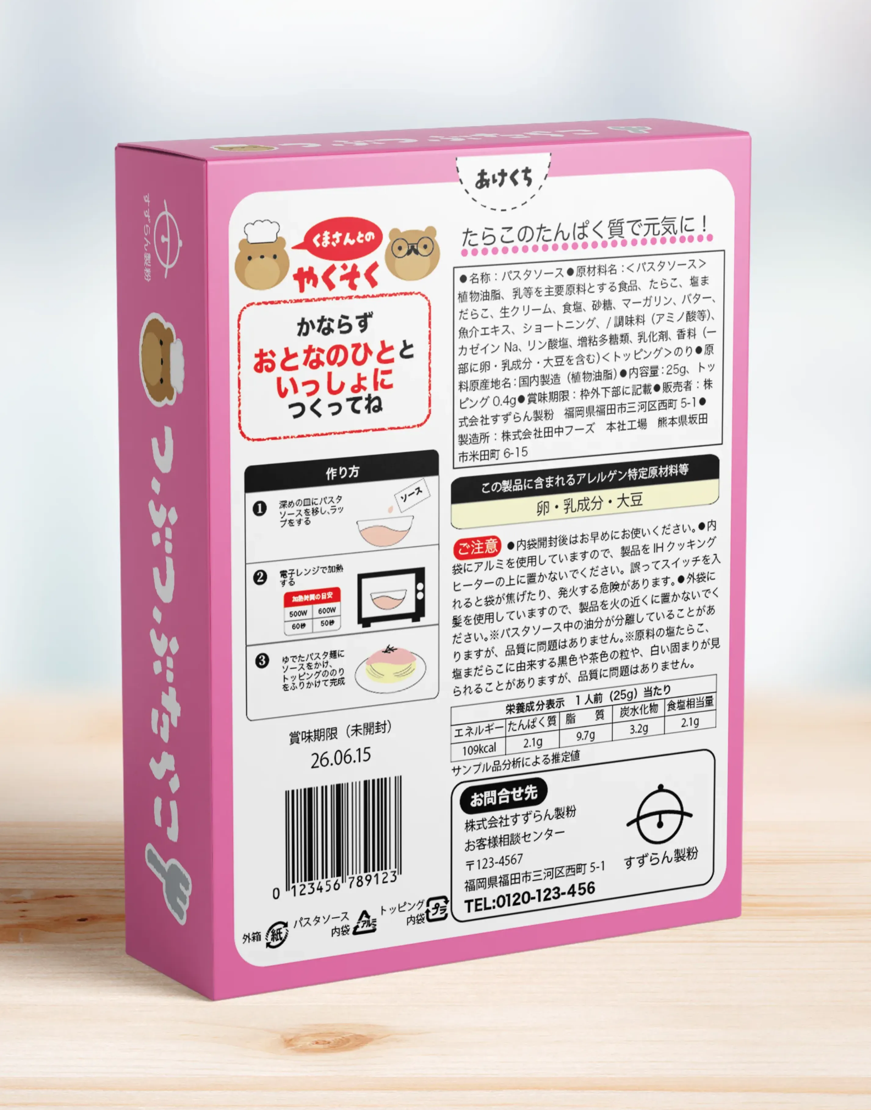 お子さまの目にとまるように可愛らしいイラストと、読みやすいひらがな、鮮やかな色を使いました。一方、お子さまがパッケージを見て、自分で開けてしまったり、自分だけで作ろうとしないように、裏に注意書きを入れました。