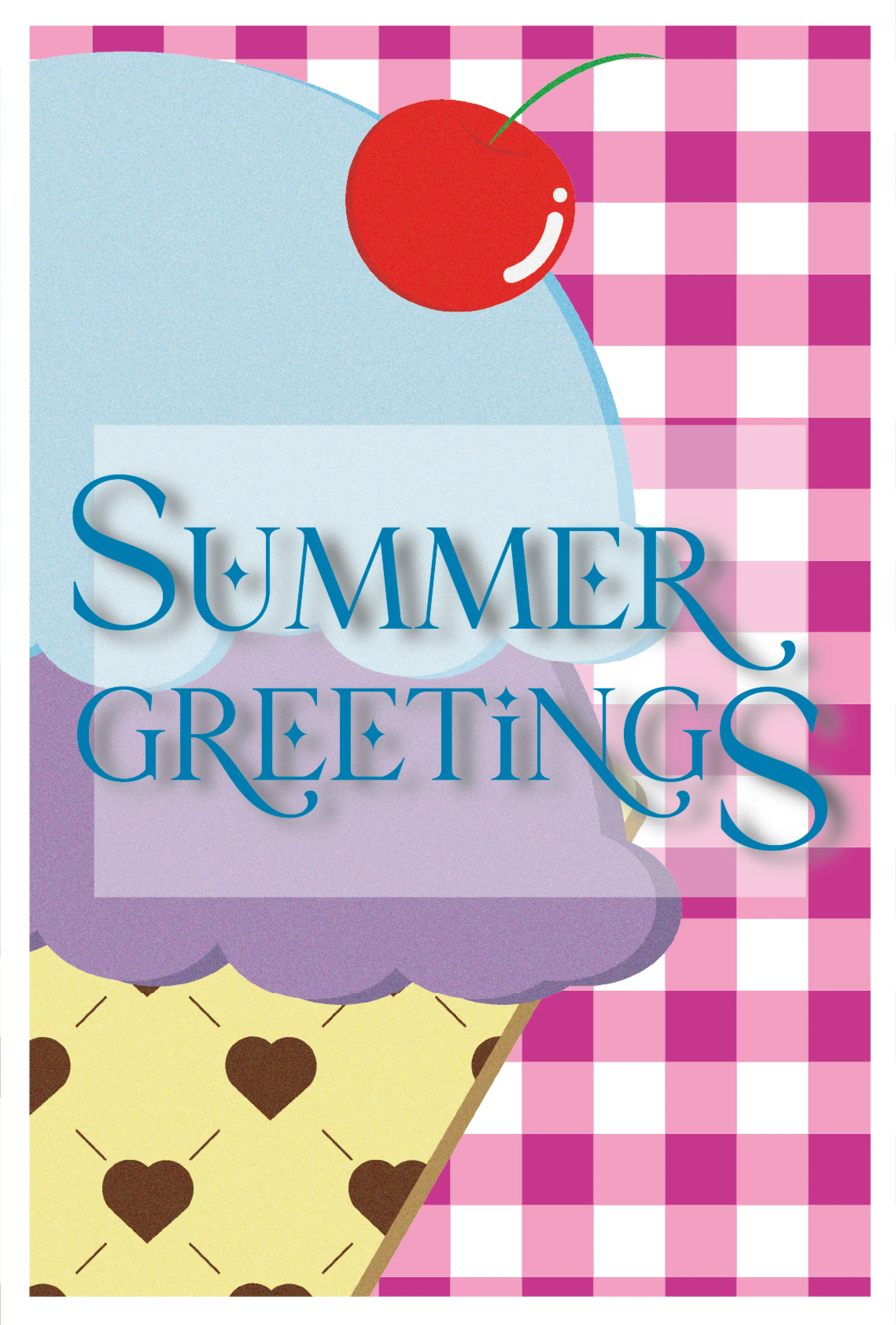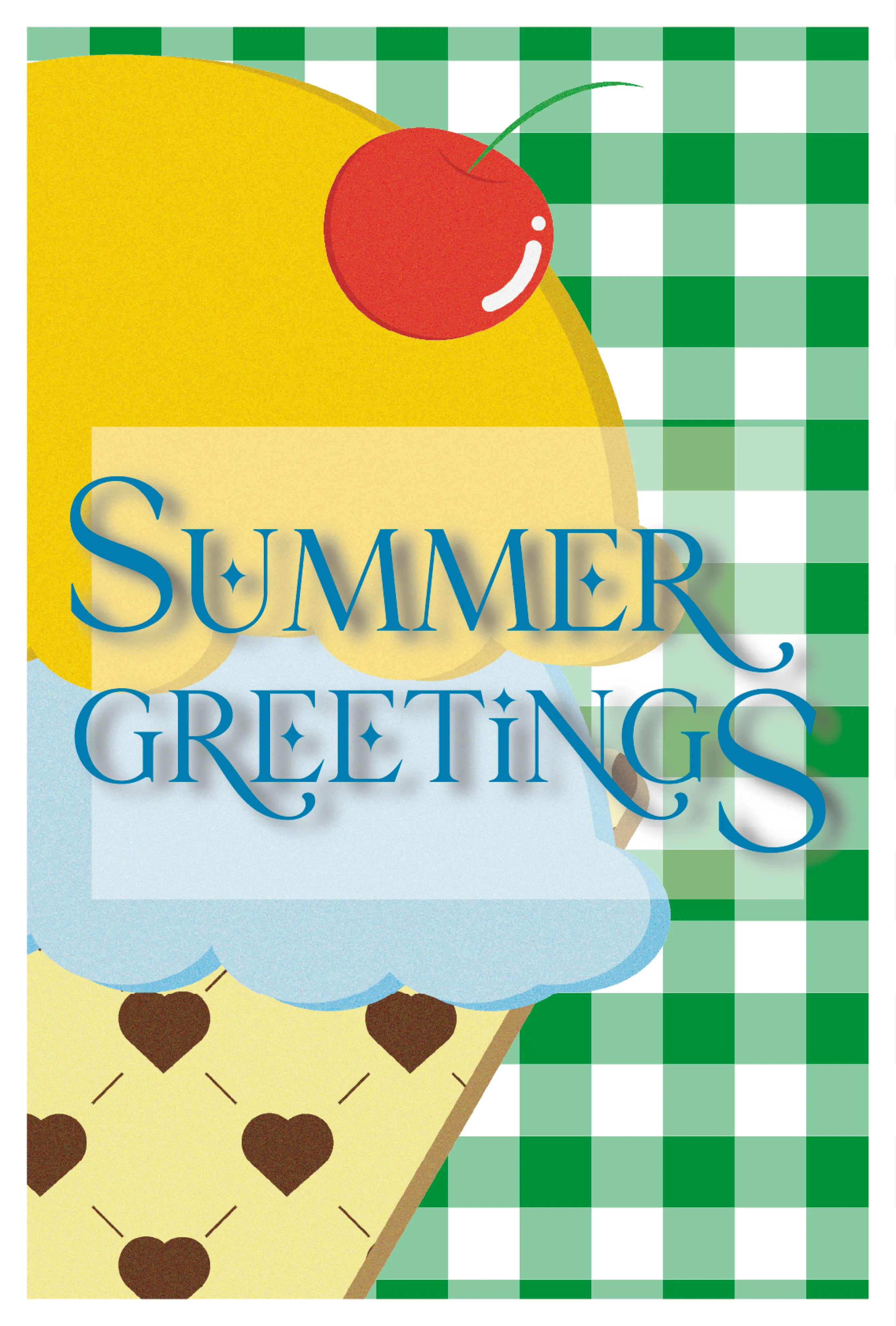 ギンガムチェックとアイスのコーンのキルティングは、パターンを作成しました。ポップな背景やイラストに加え、文字のフォントや色で爽やかさを出すことを心掛けました。また、イラストを手書き風にするために、ざらついた効果をつけました。